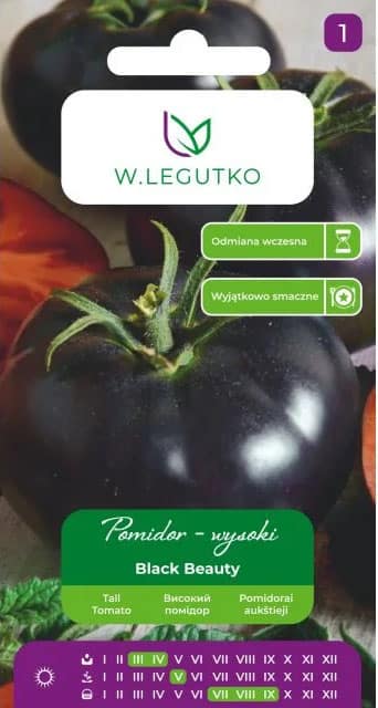 Black Beauty Tomato (Solanum lycopersicum) is a unique variety with dark skin and a deep red interior. Tall, early, and highly productive – suitable for outdoor growing and under cover.